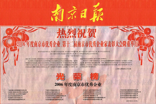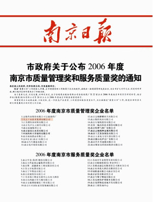 我公司荣获由南京市人民政府颁发的“2006年南京市质量管理奖”。该奖项是对卓越绩效的评价和认可,主要围绕企业在质量管理方面的一系列工作做出测评,