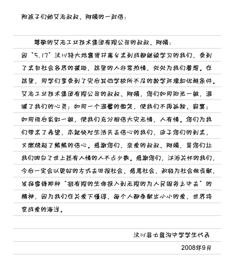 艾志工业技术集团有限公司作为企业在发展壮大的同时,也将公益事业作为担当起社会责任的行动融入到企业文化中。512大地震后,四川汶川的教育设施受到了毁灭性打击,艾志工业技术集团有限公司与艾志长期合作的国际友人一起携手,帮助汶川早日度过难关,让灾区的孩子们早日绽放笑容。