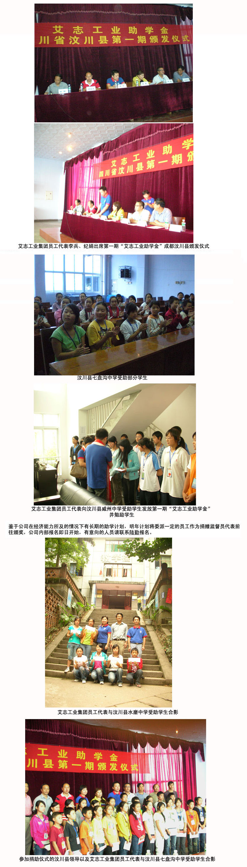 继2008年8月29日艾志工业技术集团有限公司在甘肃秦安县第五中学颁发了第一期“艾志工业助学金”后,UED(中国)成都办员工李兵、纪娟于9月12日上午九点,在成都青龙场西南石油大学汶川县七盘沟九年一贯制中学临时安置点参加了第一期“艾志工业助学金”四川汶川颁发仪式。当地政府和校方对艾志工业技术集团有限公司的善心表示热烈欢饮和衷心感谢,汶川县人民政府副县长王霞等有关领导出席了“艾志工业助学金”的颁发仪式并发表讲话。
