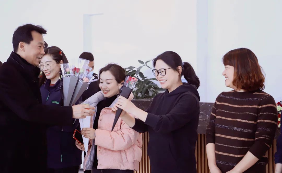 幸得识卿桃花面,从此阡陌多暖春。 三月春风惹人醉,三月是充满希望的季节,温暖、新生、花香绵绵。从三月里款款走来的女子,仿佛盛开的桃花,粉黛略施,却不张扬,轻轻奏响世间最美的赞歌。 今日的鲜花,由秦经理的男团组合精心挑选并用心包装,总经理赵景阳先生、工会主席张军先生为女神们倾情献花,看女神们的欣喜笑容就知道有多满意。